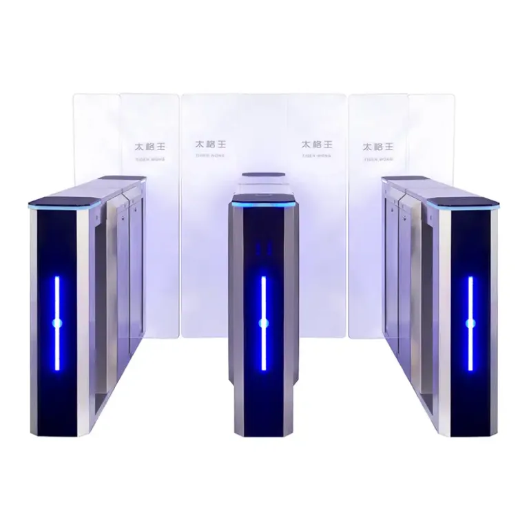 Sliding gate turnstile with stainless steel cabinet, acrylic panels, LED counters, and infrared sensors.